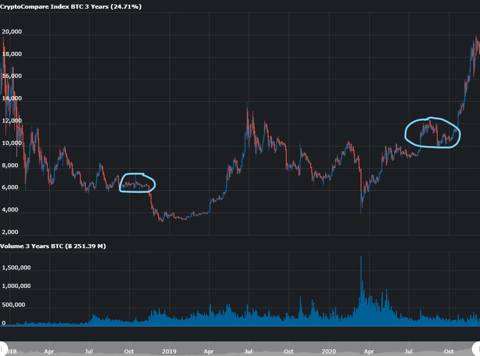 Explicando porquê, o preço da Bitcoin está a consolidar abaixo dos $20,000 na área dos $19,000-$19,000. Olhando para a historia a criptomoeda faz sempre um período de consolidação antes de movimentos fortes, como vimos a consolidação acima dos $10,000 antes de tocar em máximos históricos este ano, e como em 2018 vimos consolidação a $6,000 antes de cair a pique para $3,000 (vê o gráfico)