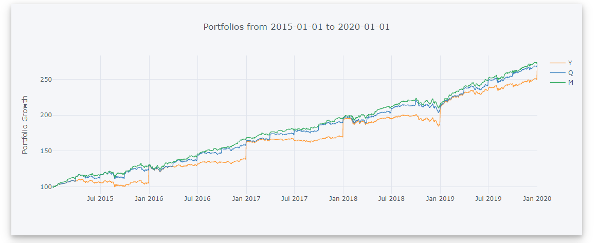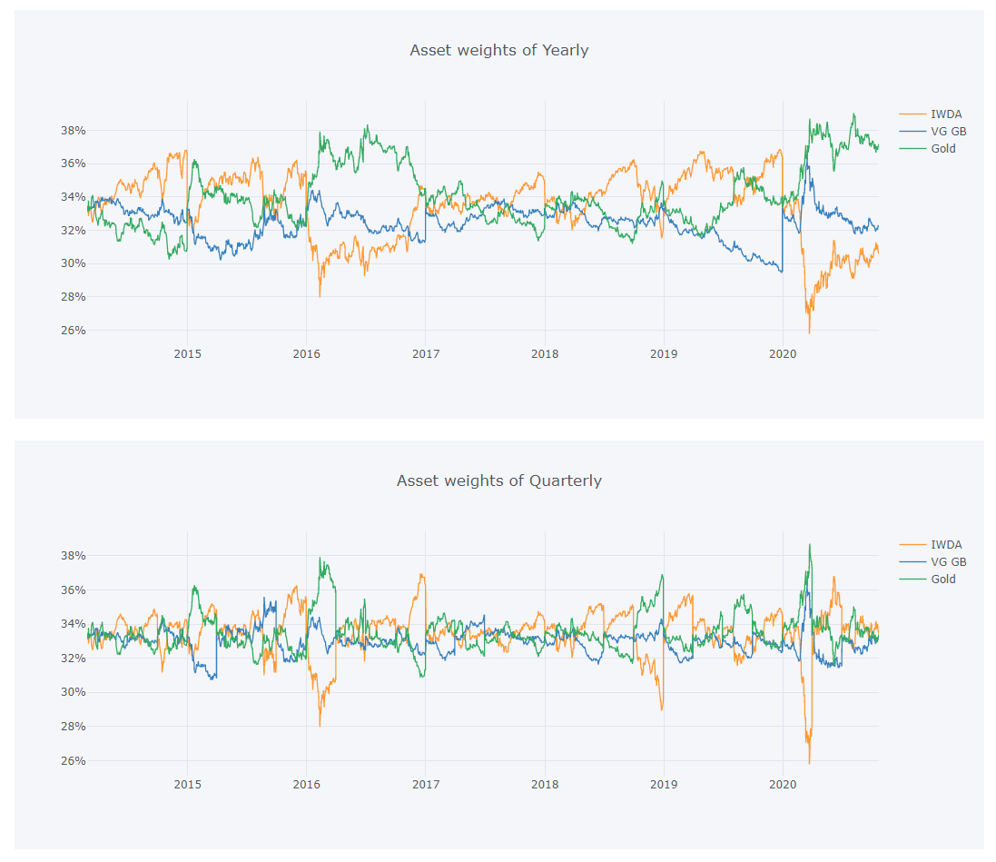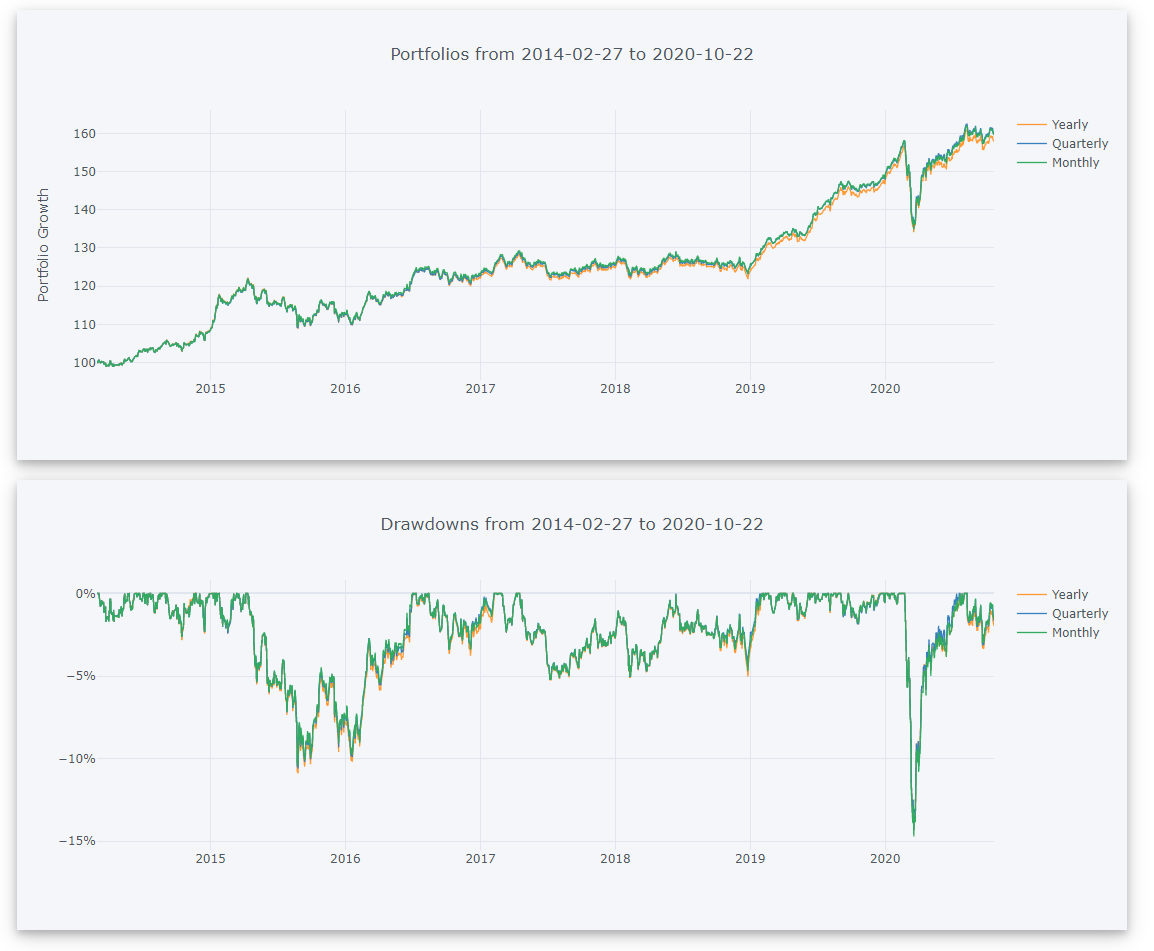 A inclusão de custos de transacção vai definitivamente a favor de rebalanceamentos/reforços anuais. Mesmo em cima em que o Quarterly/Trimestral ganha ao anual nos rebalanceamentos pode ir por água abaixo caso os custos de transação sejam 0.1% por exemplo. Ou seja, inclusão de custos só beneficia os rebalanceamentos anuais.