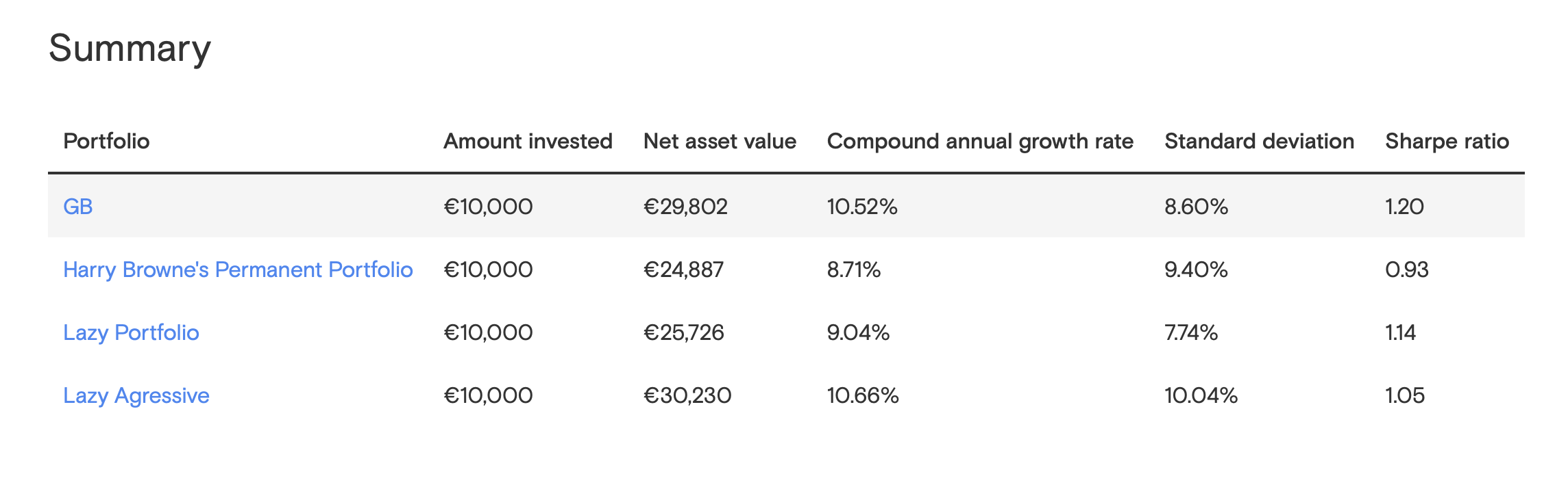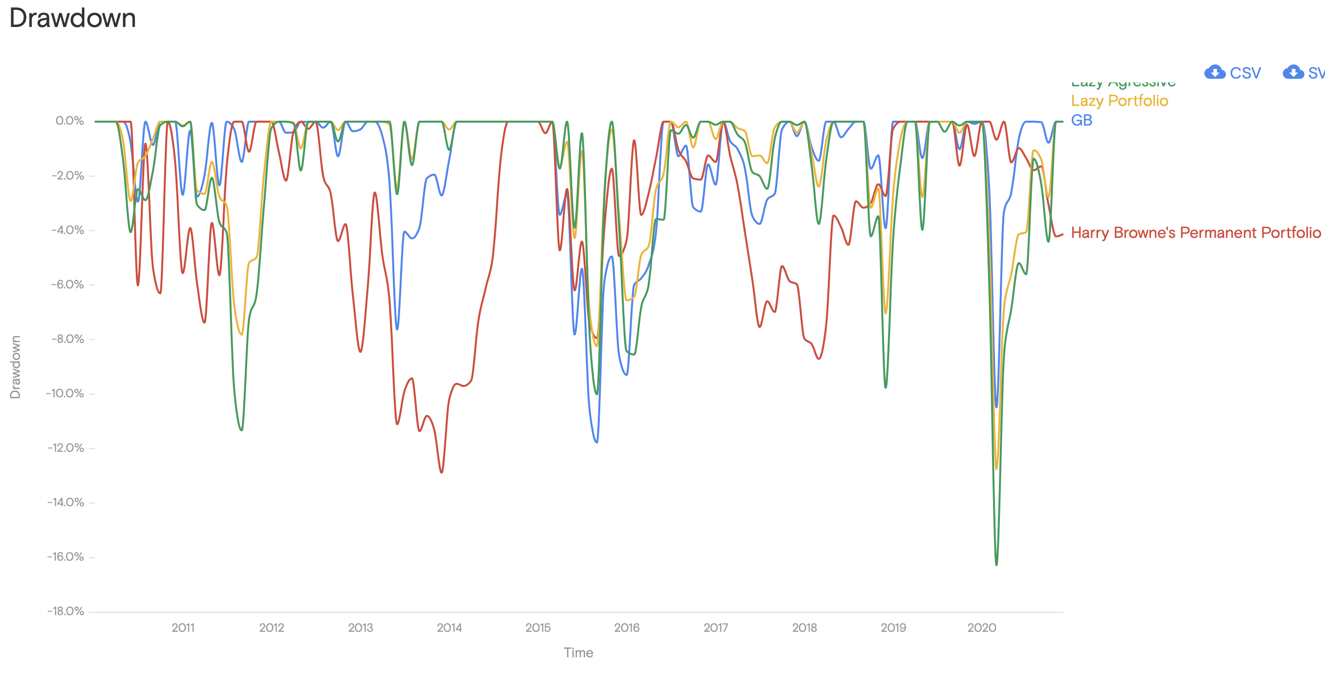 Olhando assim e analisando de forma leiga, o GB andou muito perto do Lazy Agressive e teve na sua maioria drawdowns menores. Mas depois pergunto-me se é justo esta comparação, dado que na composição do GB não consigo meter os Certificados do tesouro e se simular com bonds curtas parece-me puxar artificialmente para baixo, ou seja, vai do 8 ao 80.
