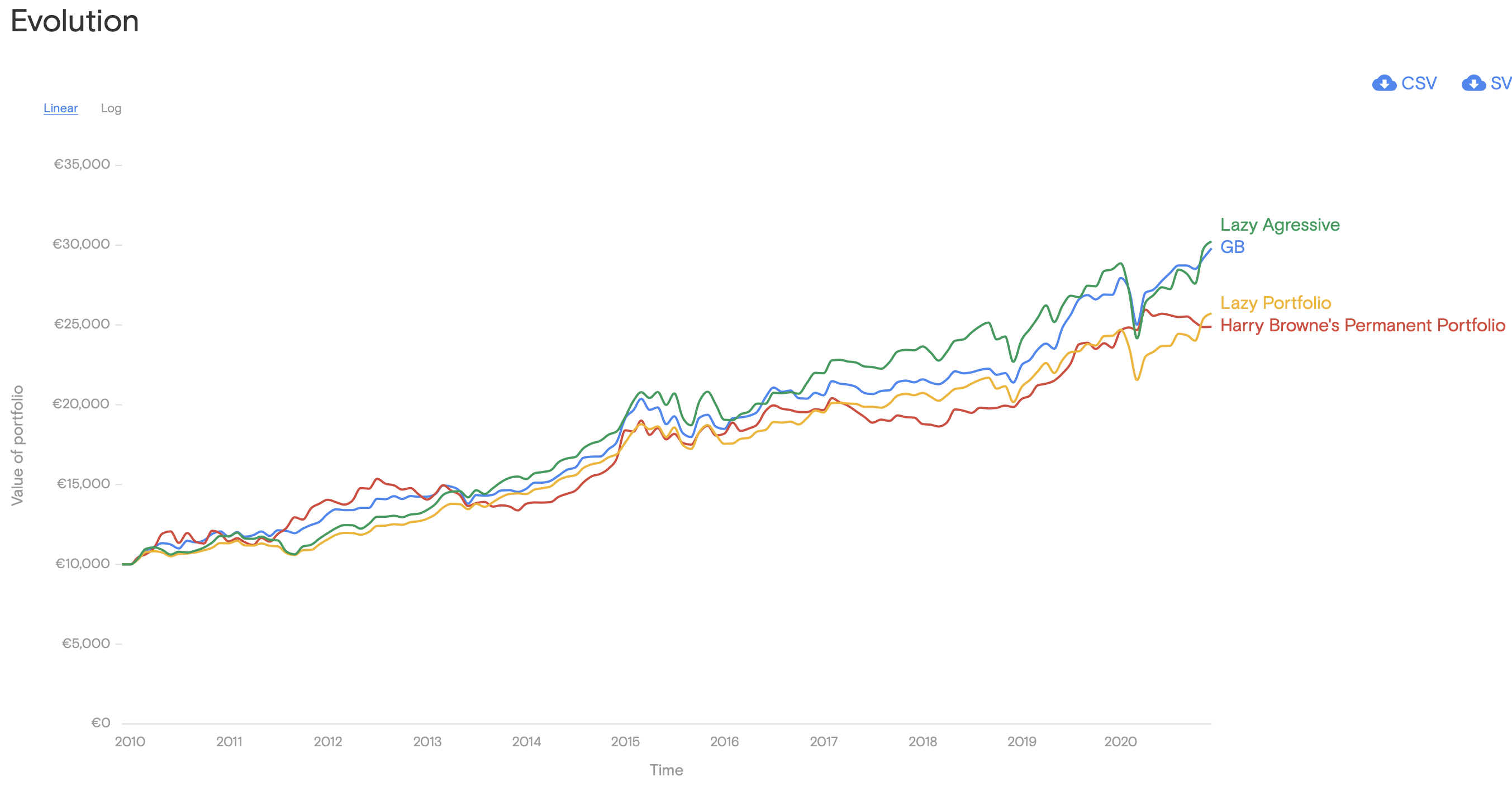 Comparei estes 4 portfolios. O Lazy Agressive é o 80/20, o GB é o alterado por mim, o Lazy Portfolio é 60/40 e o PP é o pré-definido pela Curvo.