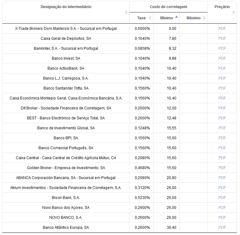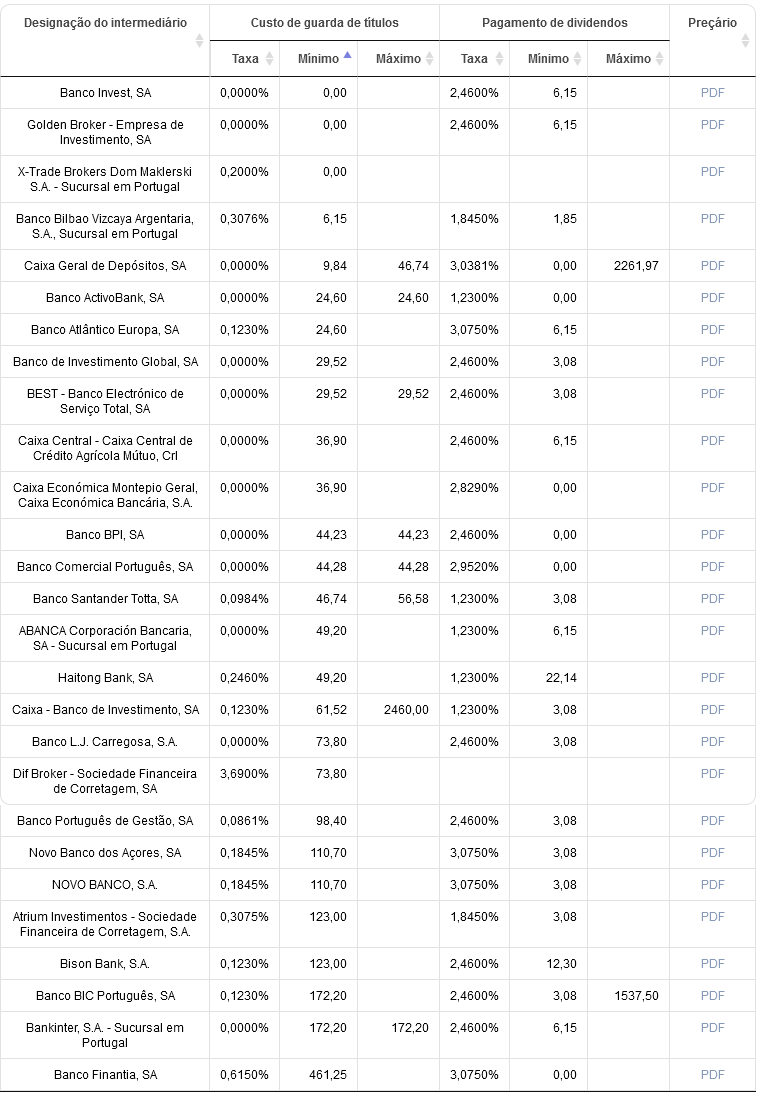 Recebemos uma tabela deste genero, onde podemos ordenar por custos/taxas e também ter um link directo para o PDF com o preçário descriminado do banco/correctora.