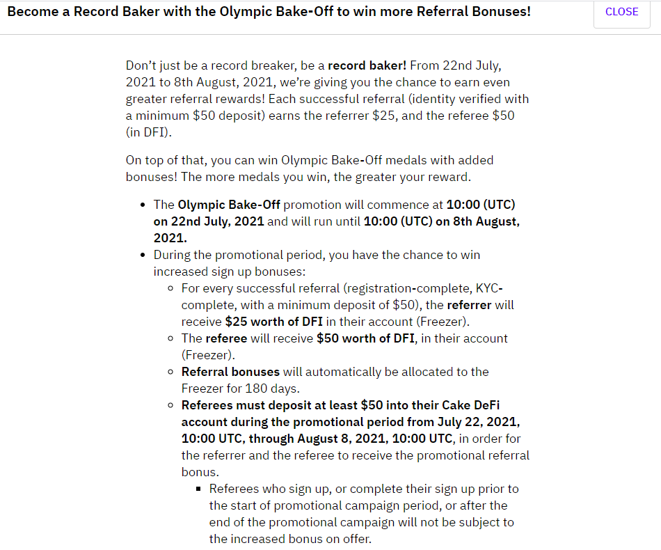 Confirmo que ainda está a dar o bónus de 30$. Eles têm também o Learn&Earn, que respondendo a um quiz, estão a dar mais 5$ em DFI. Logo, são 35$ em DFI que ficam retidos por 180 dias.