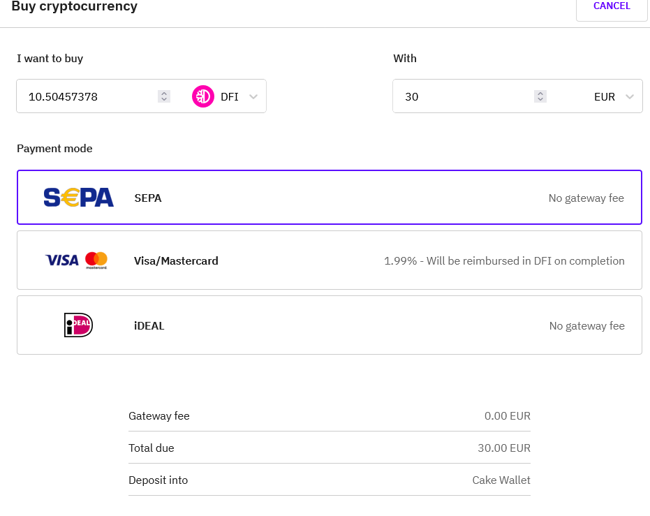 Se não têm conta noutro lado, usem o botão BUY na Cake e comprem DFI diretamente (screenshot abaixo). Garantam que compram o suficiente para ser acima de 25$ e o bónus é automático.