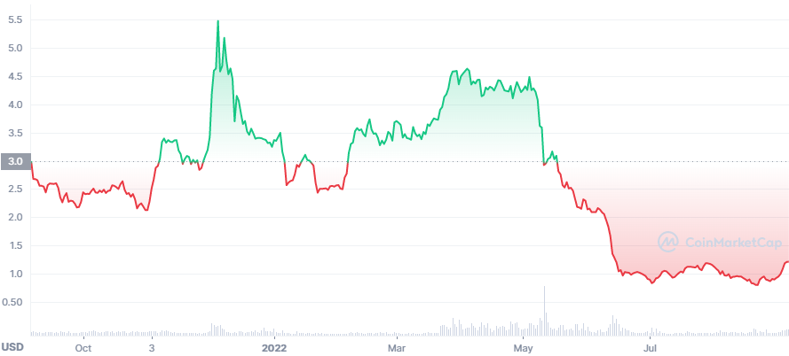 Se a adesão for motivada em grande parte pelo bónus, que fica bloqueado por 6 meses, a evolução das últimas 2 semanas é pouco relevante. Eis o gráfico de 12 meses, com grande queda desde maio, tal como na BTC e tantas outras.