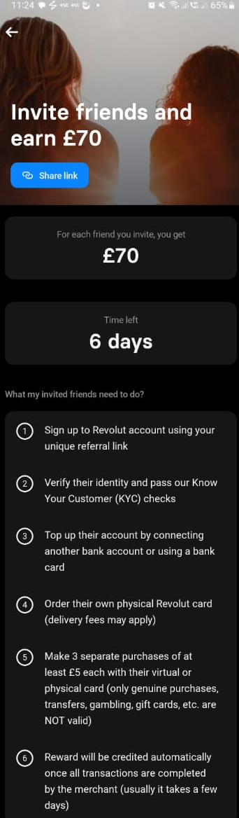 Caso os convites do user anterior tenham esgotado, o meu Revolut gera £70. Eu posso enviar £35. Tem é de ser feito rápido, porque faltam 6 dias para o término --- geralmente são 5 minutos de "trabalho".