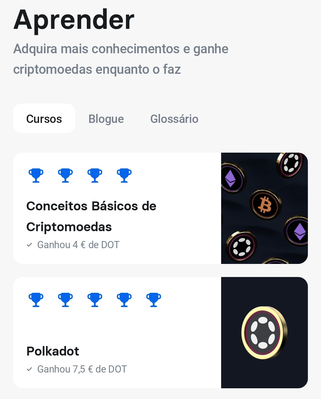 São 4 cursos de 1€ sobre criptomoedas, e 5 cinco cursos de 1.5€ sobre polkadot