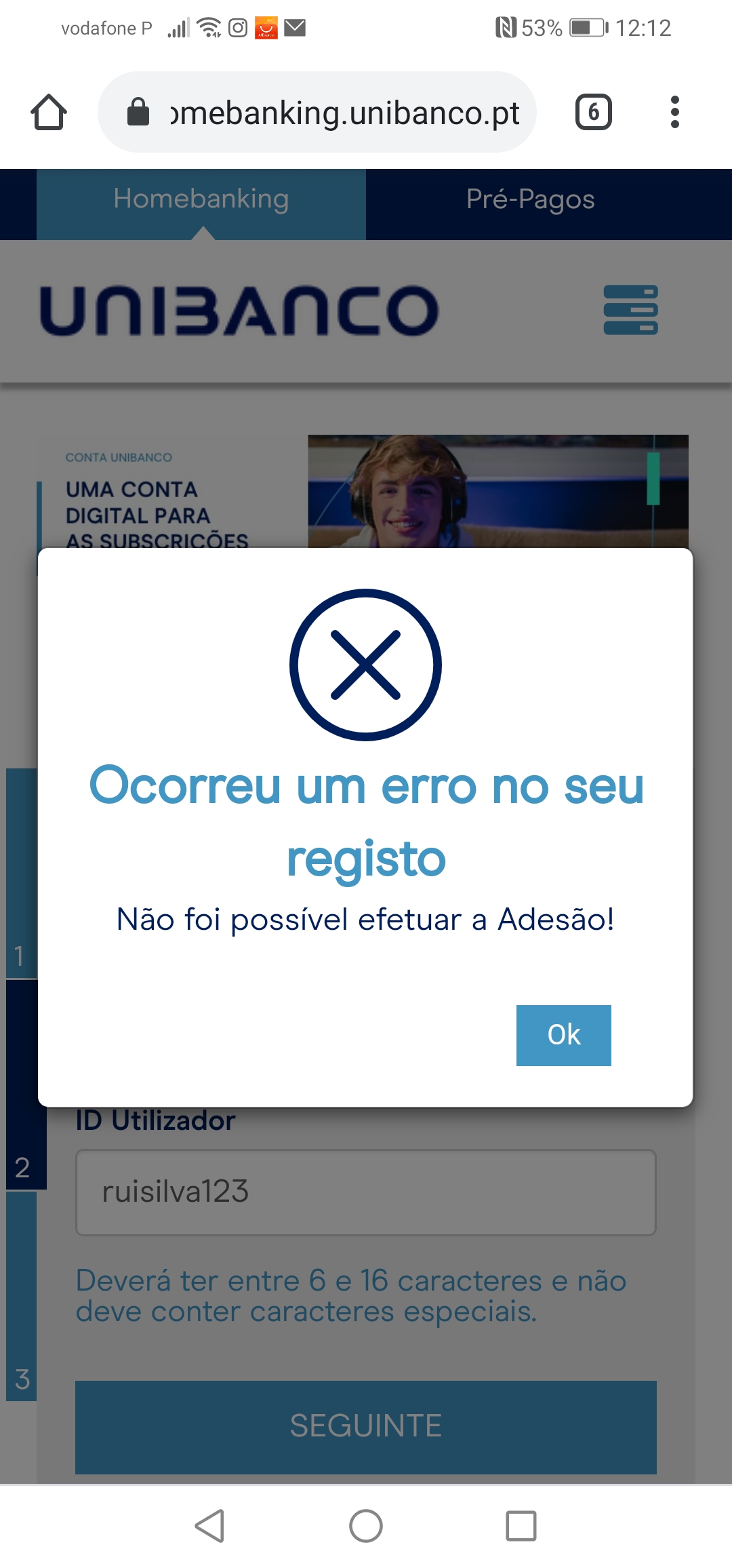 Em relação à Homebanking não estou a conseguir fazer a adesão aparecendo o erro que vou colocar em anexo mas amanhã quando ligar pra lá peço a ver se resolvem