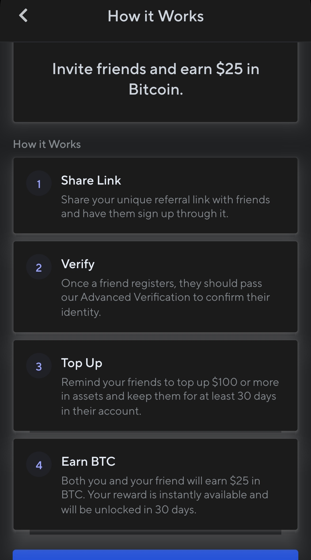 O programa de referidos está com uma promoção até 31 de dezembro sem data limite onde oferecem actualmente $25 em BTC para referente e referido com abertura de conta KYC e um depósito mínimo de $100 durante 30 dias.