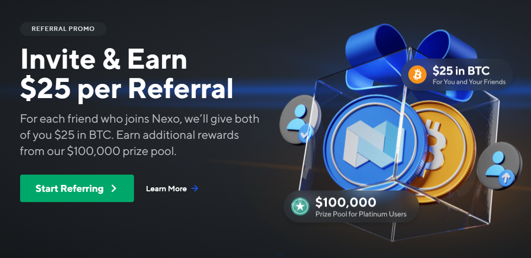 " you and your referrals will both get $25 in BTC within 30 days of them passing Advanced Verification and topping up the equivalent of $100 or more of any asset supported on the Nexo platform."