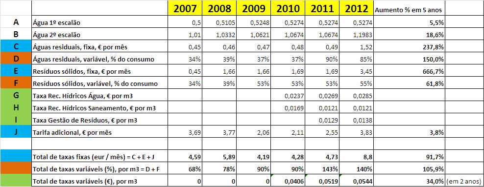Dei-me ao trabalho de analisar as facturas da água desde 2007 para ver a evolução das taxas associadas, pois eu suspeitava que tinham vindo a aumentar (o concelho é Loures).O que não pensei foi que tivessem aumentado desta maneira...