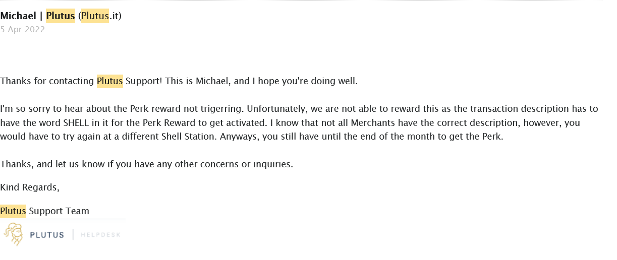 Expus a situação ao suporte da Plutus e resposta foi que não podem validar esta transação precisamente porque não aparece SHELL no nome.