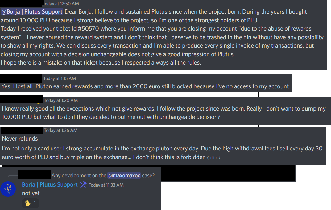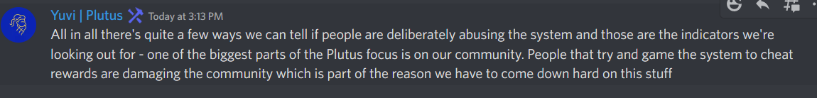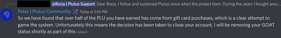 Então deixam andar por lá Amazon scalpers (o Dave Twice, por exemplo) e clientes comerciais (Taylan, por exemplo, estoura os máximos de gastos anuais de 3 cartões crypto em cashback: Plutus, Wirex e outro que já não sei) que têm gastos astronómicos e sacam PLU a torto e a direito com dinheiro que não é deles, e depois vêm com a conversa da comunidade e protegê-la.