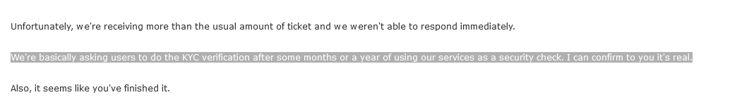 O pedido de KYC intrigou-me, mas fiz na mesma antes de me responderem: literalmente submeti os scans e 1 minuto depois recebi email de verified. Visto o sistema ter sido tão automático, sugere que a verificação quando falha não é de forma propositada, será porque simplesmente o sistema não conseguiu ler os dados.
