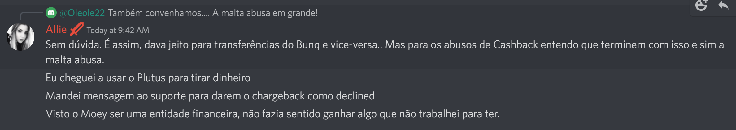 Andaram a insultar o outro user e já tinha visto no discord essa rapariga a dizer que era um banco. Até acho que foi aqui no fórum que publicaram essas mensagens. Às tantas o outro nem tinha nada a ver com isso até o terem insultado. Anyway, a mim não me faz diferença. Tenho o cartão plutus há um mês e não usava top-up moey! para ter cashback.