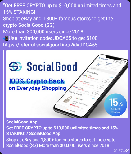 Shop at eBay and 1,800+ famous stores to get the crypto SocialGood (SG)