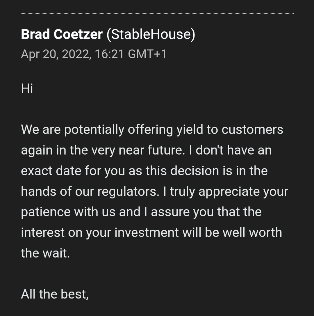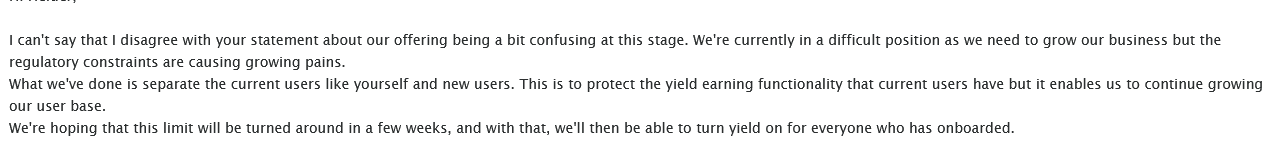 We operate under strict requirements from the Bermuda Monetary Authority (BMA). This is to ensure your assets are safe at all times. Last month, we reached the temporary limit set by our regulators. While we work closely with the BMA to get these limits updated, we have to temporarily bring the number of yield-earning users and assets under management down.