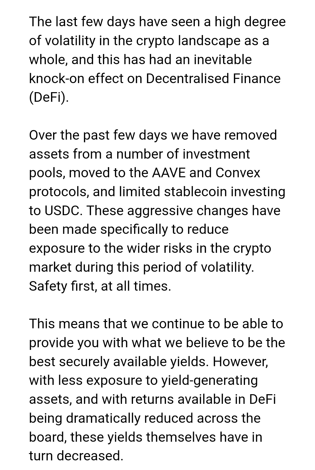 Aqui não estamos directamente expostos a uma só stable, mas sim a um misto de umas quantas delas, usdt-usdc-dai (maioritariamente). Não estou a dizer que o risco é zero, mas que pelo menos é menor que estar directamente exposto a uma só