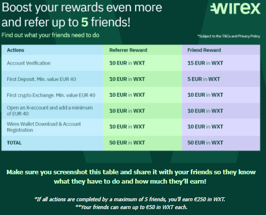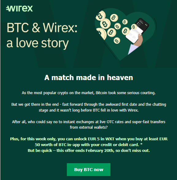 A Wirex é mais uma plataforma de compra e venda de Crypto. Tem cartão gratuito que devolve 0,5% de cashback na moeda proópria WXT Neste momento estão com a seguinte campanha:   Pas
