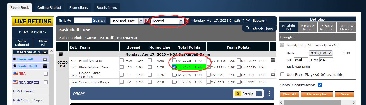 4 - Para não perder muito dinheiro, procurei um jogo da NBA e na parte dos pontos existem muitos jogos que pagam 1.9 acima de um valor e 1.9 abaixo desse valor.