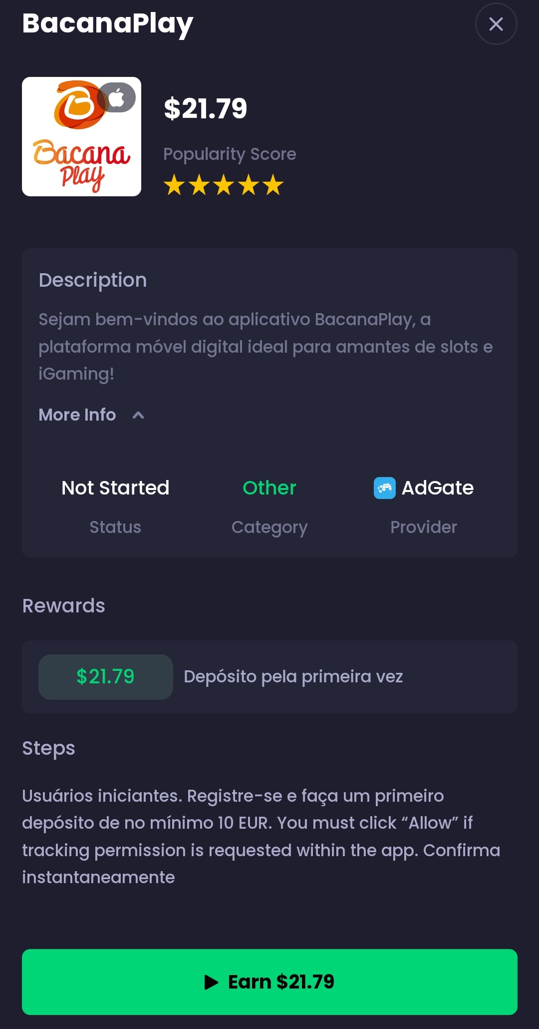 21.78$ por registar e depositar 10€, na Adgate. Paga imediatamente após o depósito.