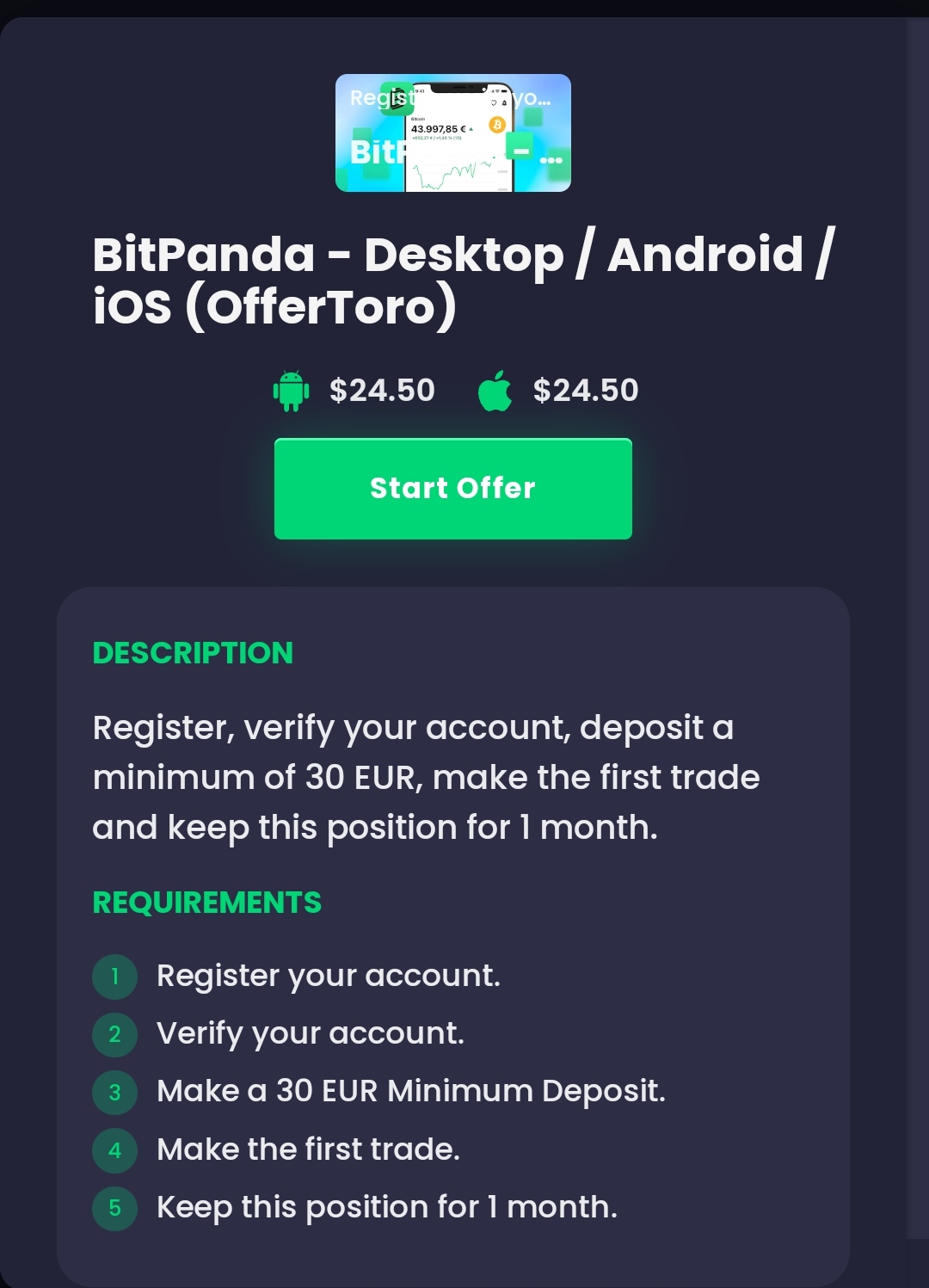 Apareceu uma oferta nova que acabei de fazer: Bitpanda cerca de 26 dólares por abrir conta, verificar identidade e depositar 30€.