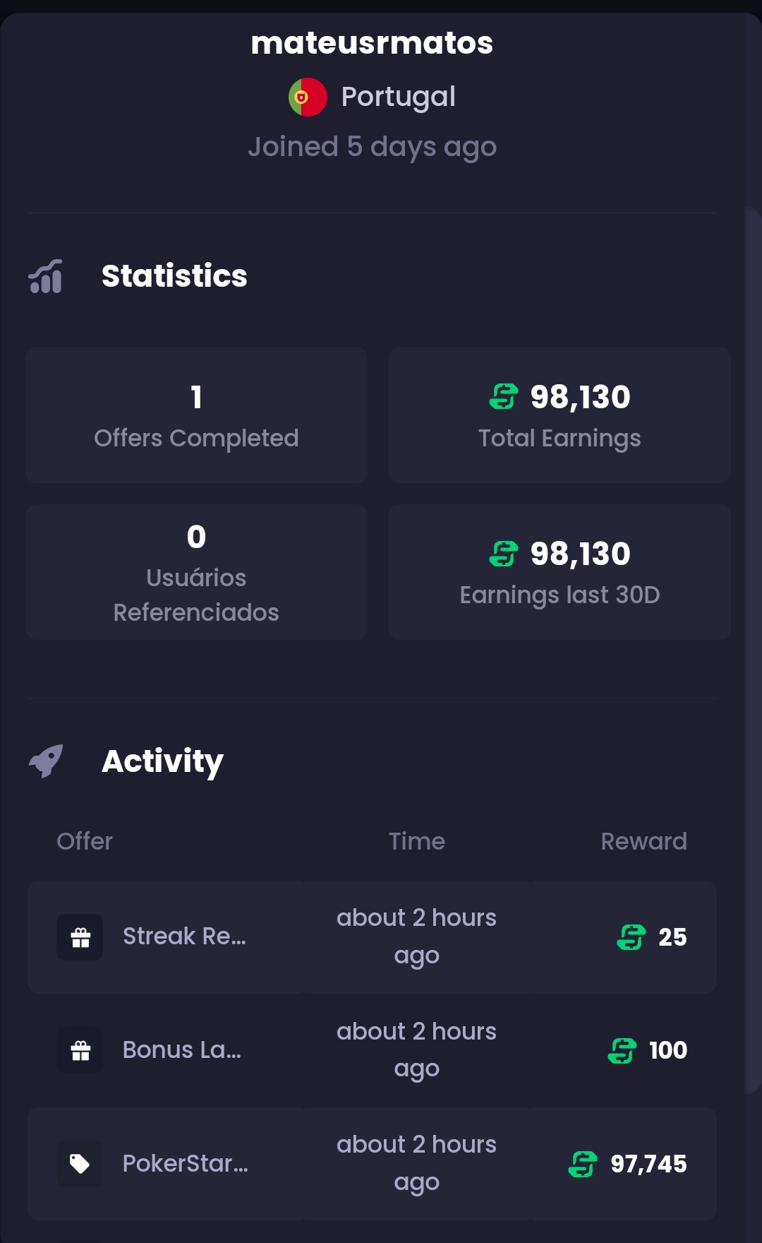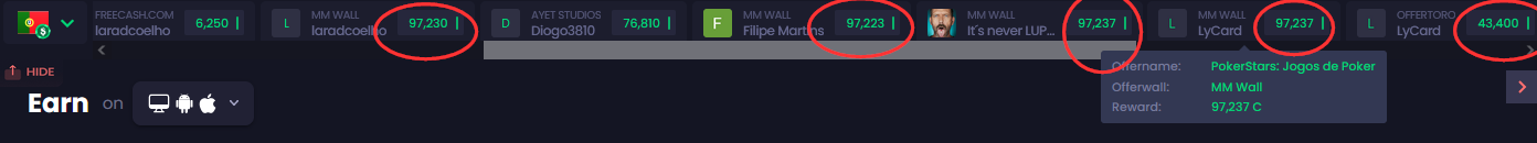 Na Freecash, dá para ver as ofertas que estão a ser pagas aos users. Se filtrar-mos as ofertas para o nosso país e superiores a $5 consegue-se perceber que alguns users têm estado a receber a oferta da Pokerstars e 888Casino.