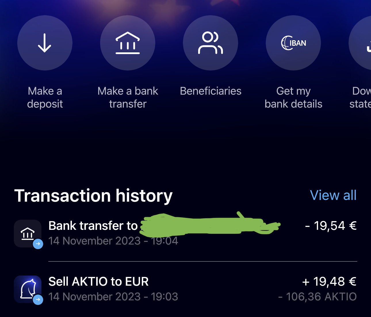 Como eles usam o sistema de transferências imediatas, demorou um minuto desde a venda do token deles (AKTO) e levantar em euros para a conta bancária.