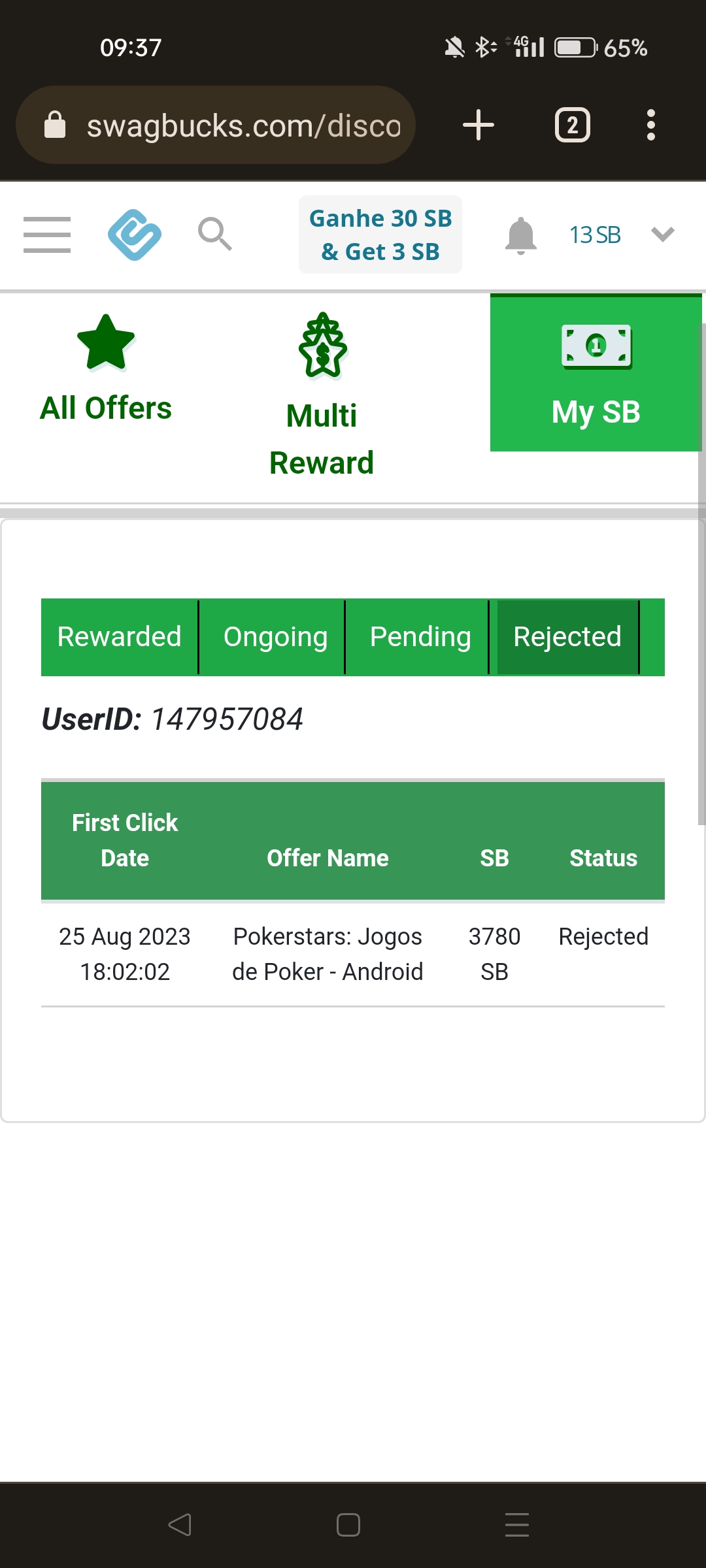 Desfecho da minha tentativa na Swagbucks: Pokerstars recusado e Onthatass recusado. Fiz tudo como mandava as regras, sem blockers, nada tudo direitinho. Ficou pendente de análise, fiz reclamação e enviaram o email chapa 5 de recusado. E pior ainda foi ter queimado 10 paus naquela brincadeira da Pokerstars (caí na ratoeira de me entusiasmar com os ganhos). Fica a aprendizagem!