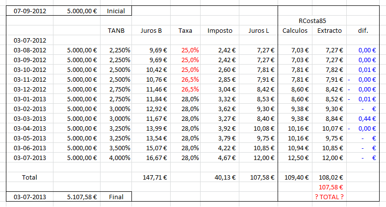 Eu tenho a indicação que o produto começou a 3 de Agosto de 2012 e não a 3 de Julho de 2012. Ele melhor que ninguêm poderá dizer se está correto. Eu não consegui obter o valor exato, 107,58€, e já efetuei algumas revisões. O melhor que consegui, foi uma aproximação com uma diferença de 0,06€...  ::):P