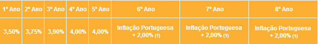(1) O rendimento mínimo corresponde à taxa de inflação média anual Portuguesa, do ano civil anterior, acrescida de 2% e está sujeito a um valor mínimo de 4,75% e a um valor máximo de 6%. A Inflação Portuguesa é igual à taxa de inflação média anual Portuguesa do ano civil imediatamente anterior ao final do período correspondente de juros. O cálculo desta taxa é feito e divulgado pelo Instituto Nacional de Estatística (www.ine.pt) através da comparação do Índice de Preços no Consumidor (IPC) médio dos últimos doze meses com o dos doze meses imediatamente anteriores.