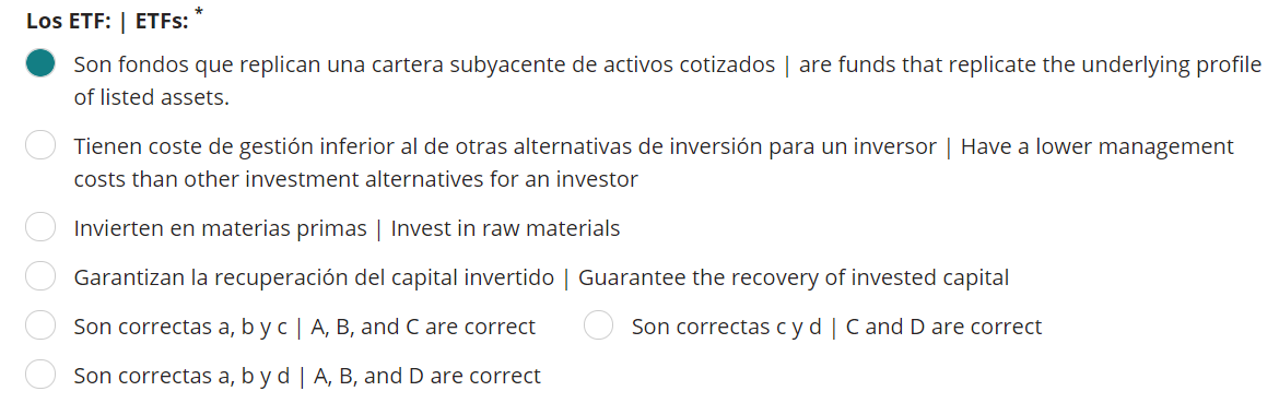 Relativamente a esta questão, a A é a única que me faz sentido, a B não é 100% verdade a C eu pessoalmente acho que é rasteira porque deviam ser ETC's e não ETF's, se investem em Raw Materials... Mas não deixo de pensar que eles se calhar esperam que nós digamos A, B e C, até porque meteram lá 3 opções para validar várias respostas como corretas...