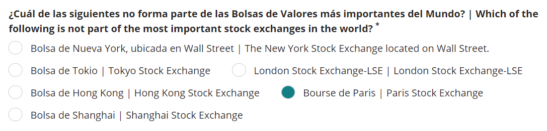 Ainda não acabei a inscrição porque estou em dúvidas no que colocar nessa questão e numa outra que pergunta qual destas não pertence às mais importantes bolsas do mundo : NYSE, Xetra, Tokyo, LSE, Shangai e Bolsa de Paris... A minha resposta deve ser Paris, porque é a que tem menor market cap, mas não faz muito sentido...