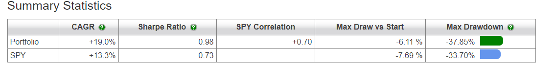 A este nível o que te interessa é MESMO o retorno ajustado ao risco sendo o sharpe e o drawdown para veres possibilidades de falência (ou quase). É assim que muito hedge fund faz $$$. Pega em algo com pouco risco e alavanca ad infinitum... Queres bater o SSO a 100% em termos de retornos? Usamos ETFs alavancados 3X em vez de apenas dois e assim sucessivamente. Até alavancares 30 vezes algo com um nível MUITO baixo de volatilidade...