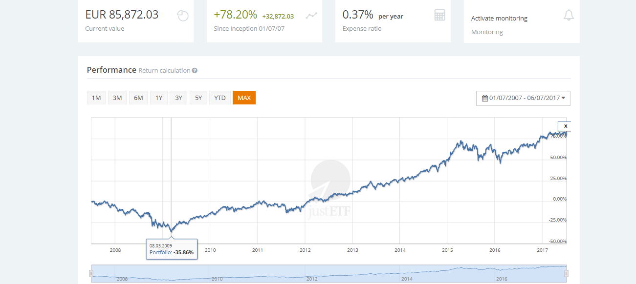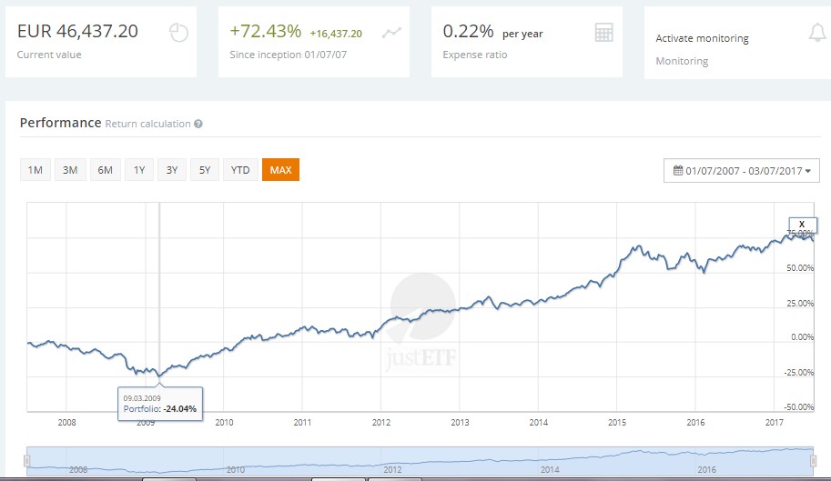 Com os pressupostos do Mouro Emprestado, descritos aqui: "Se quiseres, deixo-te o desafio de testares essa carteira no JustETF num pressuposto igual aquele que deixei neste post, ou seja, capital inicial de € 10k a 1 de Julho de 2007, reforços anuais de € 2k a cada 1 de Julho e custos de € 15 por cada transação de ETFs, para compararmos as rentabilidades históricas"