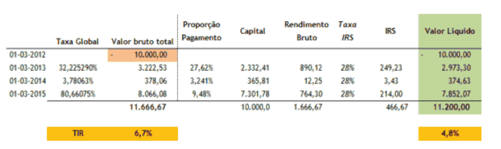 Por acaso vinha já o resultado final em termos líquidos na mensagem que o BEST me enviou sobre o produto. O cálculo não se faz de caras, pelas razões apresentadas acima. Pelos vistos eles concentram o pagamento dos juros no final enquanto que o que se recebe anualmente é essencialmente capital. Daí que o resultado final seja inferior a aplicar os 22.4% ao rendimento bruto, mas mesmo assim consiga ser bastante próximo disso.