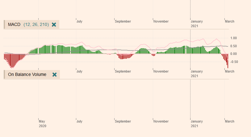 O ativo está sobrevendido pelo RSI, mas pela linha do indicador MACD o ativo pode ainda continuar a cair, pois ainda não reverteu para uma subida, continuando assim num movimento baixista, logo ainda não há um sinal de compra, pelo que o ativo deve ser acompanhado e quando a linha do MACD reverter para uma subida, aí pode-se iniciar um movimento altista e consequentemente formular um sinal de compra. Assim, atualmente o ativo ainda não bateu no fundo.