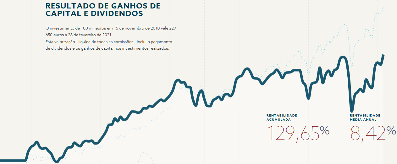 Eles são bastante abertos quanto ao desempenho da estratégia que têm feito ao longo dos anos, comparando com o net return do MSCI World, tanto em formato tabela como em gráfico: