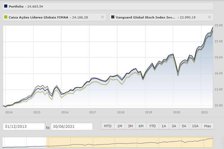 Então fiz o seguinte, fiz no excel a valorização de ambos os fundos com um valor inicial de 1000 €, sem reforços, e o Caixa valoriza mais cerca de 19€ quando comparado com Vanguard, o que não bate certo com o gráfico que colocaste. Provavelmente aquele últimos meses de 2013 deve dar vantagem ao Vanguard mas há-de ser por uma diferença pequena.