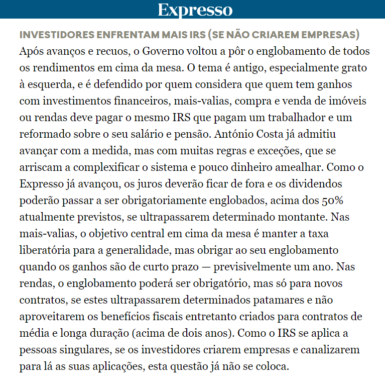Fica o excerto do artigo do Expresso sobre o tema do englobamento de mais-valias. Conclusão do artigo: tudo a criar novas empresas.
