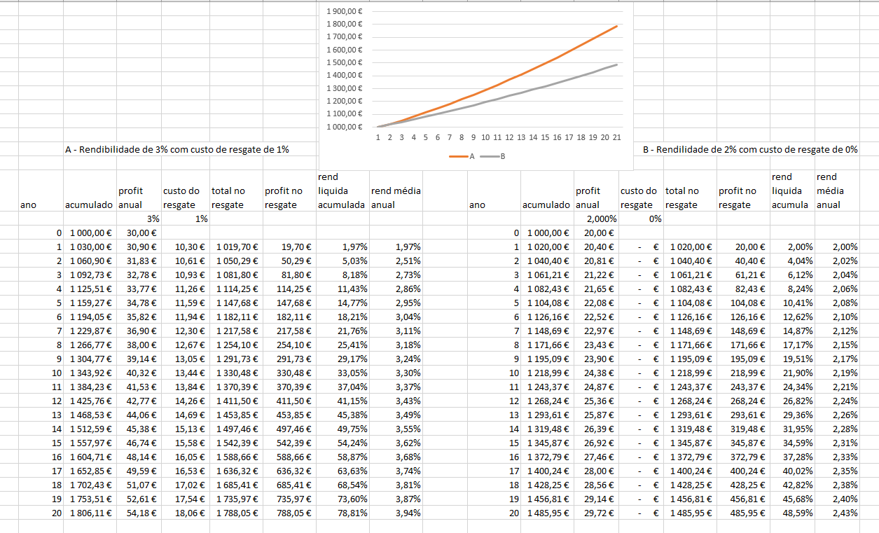 Eu ponderei esse FI, mas não gostei do facto de ter uma comissão de resgate de 1%, afastaram-me logo. Mas aproveitei para fazer um excerício que pode ajudar a explicar que ter uma taxa de resgate de 1% em cima de uma rendibilidadade de 3%, não significa obrigatoriamente que a rendibilidade líquida será 3-1 = 2%.