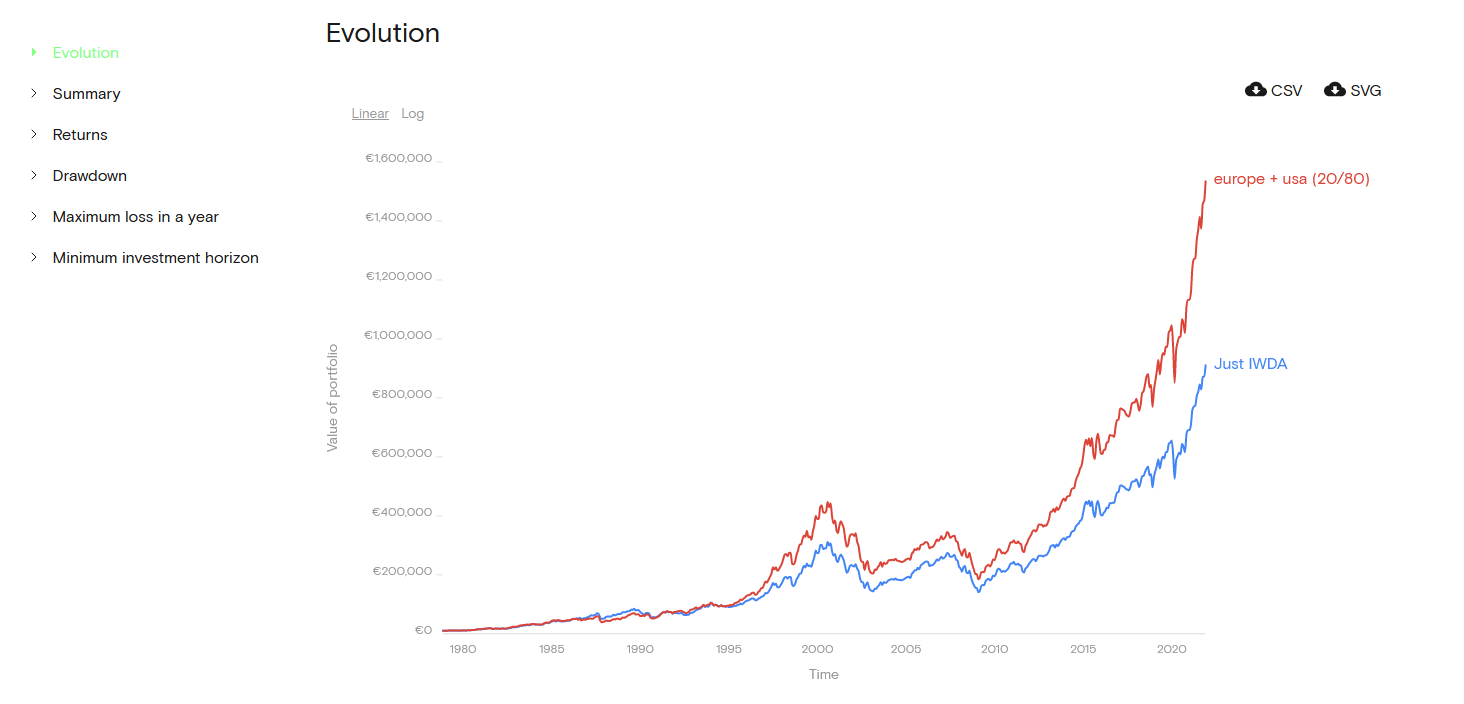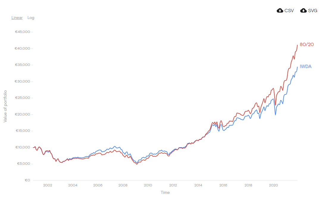 De qualquer das formas parece-me que o 80/20 bate por ter um tilt para os USA (se agora é pequeno em 1980 era gigante porque em 1980 USA deveria ser para aí 30 ou 40% do MSCI World). Resumindo com o backtest 80/20 estás já a ter conhecimento que o maior mercado accionista  em 1980 (o Japonês) teve uma underperformance brutal nos 30/40 anos seguintes.