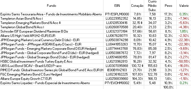 Fiquei bastante surpreendido com algumas evoluções nestes últimos dias, pela negativa, nomeadamente alguns fundos de risco 3 que possuo e que passaram de uma valorização acumulada na ordem dos 4% para perdas de 1% no espaço de poucas semanas. Mais uma vez não significa que eu não estivesse preparado para essa possibilidade, mas considerava que até ao nível 3 de risco ás perdas seriam menos severas e não tão rápidas.