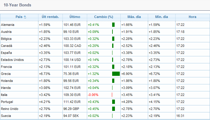Então no quadro das bonds o que vês a verde são a subida das obrigações, e onde estão as taxas de juros verás que baixaram relativamente ao dia anterior, ou seja, sempre que aparecam a verde é bom sinal.