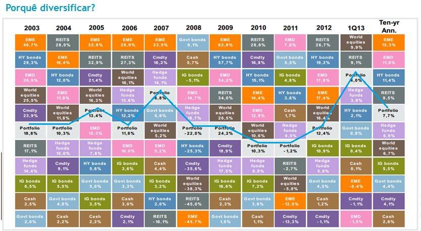 Olha que não, olha que não... é um chavão com todo o sentido, basta olhares para o quadro que coloquei acima, tudo a cair ou a subir não quer dizer que seja na mesma proporção, hoje por exemplo bolsas a cair mas muitas obrigações governamentais a subir, sem diversificação a eficiência de um investimento nunca será proveitoso, a não ser que se faça tiro certeiros, e isso nem o Buffet lol, que também diversifica.