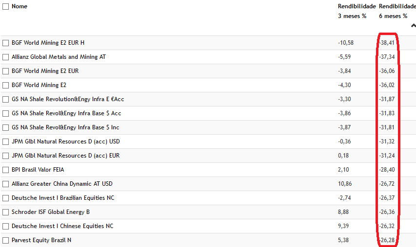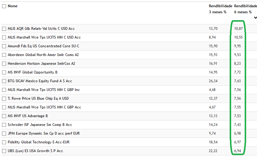 Rentabilidades a 6 meses, os melhores fundos e os piores fundos no banco Best.