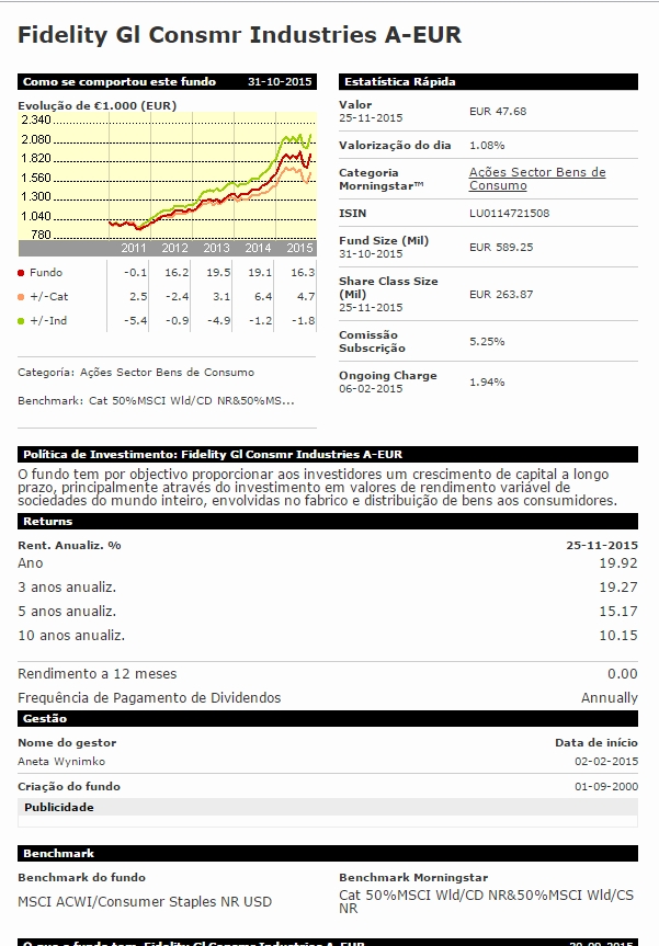 E ficas muito bem servido, aliás, são fundos que apesar de terem o mesmo alvo ( bens de consumo ), a politica de investimento é diferente, o Eurizon aposta numa gestão mais defensiva e menos volátil, como empresas como coca cola, pepsi etc, o Fidelity tem uma aposta mais versátil, em empresas também elas menos "certas"  a nível de consumo das pessoas, como a Walt Disney, Amazon, Loreal etc, pelo que , são fundos que podem até "casar" bem numa carteira, apesar de que as rentabilidades têm sido semelhantes.