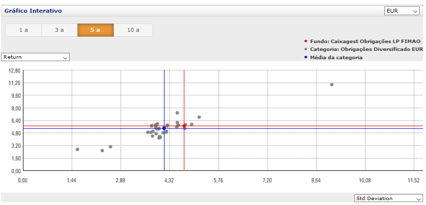 Agora repara na imagem que coloquei, o teu fundo não está muito longe da média de outros fundos da mesma categoria ( obrigações flexíveis ), no entanto como referi tem uma volatilidade alta, embora não se possa comparar a um NB Euro Bond ( aquele ponto cinzento lá bem á direita, que está com uma volatilidade de 9% mas também é o fundo de longe com melhor rentabilidade anualizada a 5 anos com 11%, este da Caixa tem 5,69% anualizados em 5 anos.