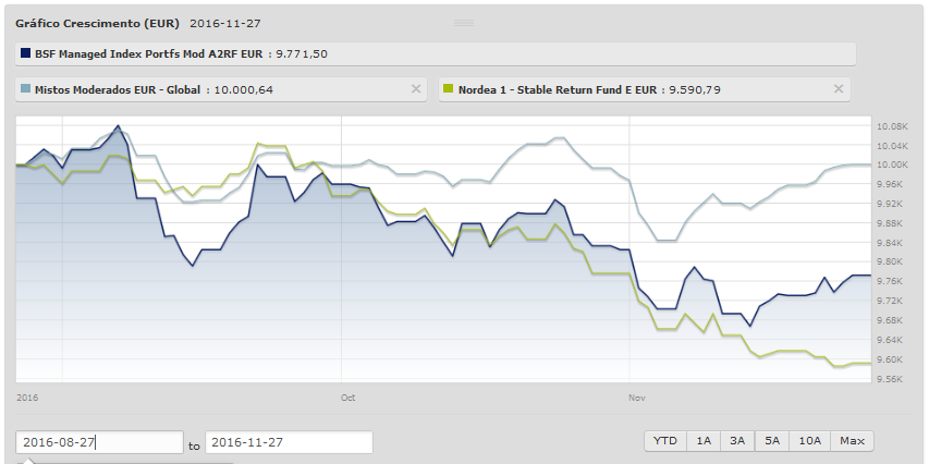 Não estive a fazer grande análise até porque têm pouco histórico, pouco mais de 1 ano, mas quis comparar ( deixo-vos 2 gráficos ) entre o Fundo da BlackRock Moderado e o Nordea Stable Return já que ambos se inserem na mesma categoria ( mas com gestão pelo que me parece bem diferente ).