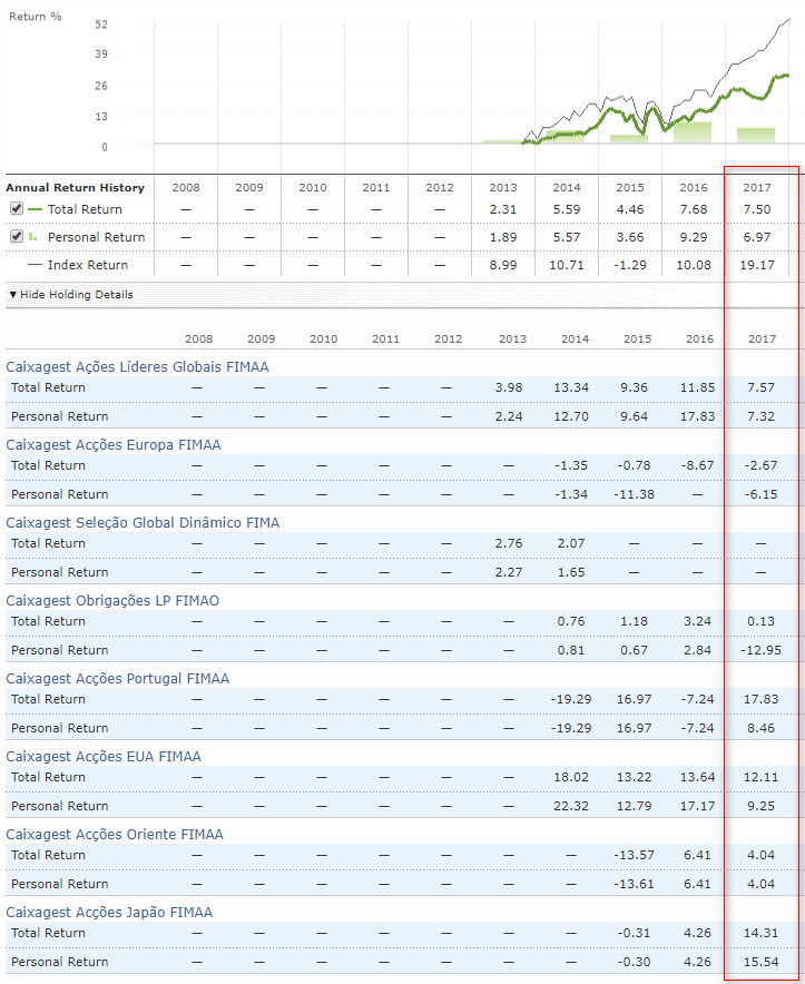 Aqui partilho convosco os meus resultados com 2017 fechado. Uma carteira 100% CGD, que em 2017 teve alocação ao mercado accionista dos EUA praticamente sempre acima de 65%. A carteira é quase 100% Mercado Accionista.