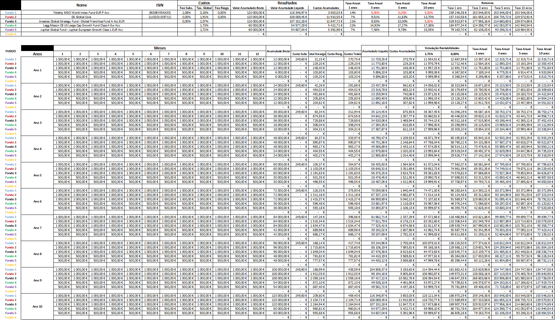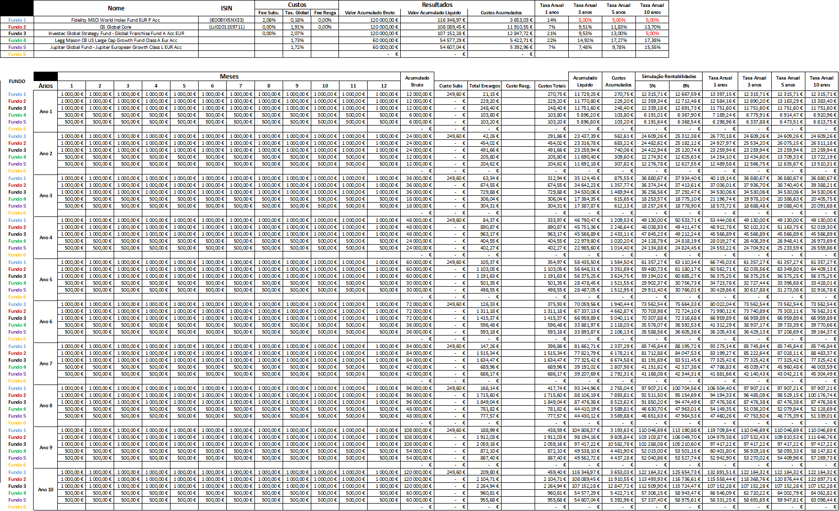O que estou a simular é o seguinte: 1000€ alocados mensalmente como reforço a cada um dos fundos e o que obtenho é o seguinte: